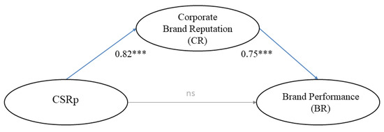 Mediation is observed when a third intervening variable supports the causal effect between the other two variables [63]. Based on the literature discussed above, brand reputation influences brand performance. Moreover, Torres et al. [64] found that CSR towards stakeholders (e.g., customers, shareholders, employees, suppliers, and communities) has a positive effect on global brand equity. Pratihari and Uzma [65], and Cowan and Guzman [66] identified a positive relationship between CSR, corporate branding, and brand loyalty, while Kowalczyk and Kucharska [24] found that CSRp indirectly influences corporate brand performance. Thus, brand reputation is expected to have a mediating effect on the relationship between CSRp and brand reputation. As a result, the following hypothesis has been formulated: