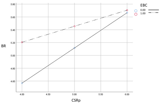 As Figure 4 shows, the effect of CSRp on corporate reputation in the total sample of highly committed employees is higher than in the group of not committed employees. Hence, a higher brand reputation effect is observed for high employee brand commitment. However, when CSRp is at the highest level, this “shift” effect is minimal. Thus, a high level of CSRp is very important if we want to build a corporate reputation. In the case of a lower level of CSRp, employee brand commitment supports reputation meaningfully. It means that the high level of CSRp is very efficient for corporate reputation, but only in cases where low employee brand commitment shifts it. Based on the verification of H3 and H4 presented in Table 3, the mediated effect of reputation for CSRp and BP relationship has been confirmed. Moreover, this mediation is stronger for less brand-committed employees. For those who are not committed, brand reputation driven by CSRp strongly supports perceived brand performance. For highly committed employees, the observed mediation effect is weaker. It means that employee brand commitment is a significant power that drives brand performance via reputation. It is reflected in the negative verification of H4a. The lack of the significant moderated effect of EBC on CSRp-BP relation is caused by the full mediated effect of corporate reputation on brand performance driven by CSRp. So, the employee brand commitment influence on brand performance by influencing on CSRp and brand reputation relation. Namely, it moderates this relation significantly (H4b).