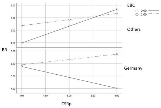 A surprising result was obtained for brand-committed German employees (see Figure 5; Table 3, H5 analysis). The effect of CSRp on corporate reputation was positive and comparable to the effect obtained for the total sample. Whereas for those of German employees who were not committed, the observed effect was negative. Therefore, we could conclude that corporate brand commitment is a much more powerful driver in Germany than in other countries, as shown by the strong negative results observed in the countries that lacked corporate brand commitment. Figure 5 shows that corporate reputation was higher in Germany than in Europe for both groups, i.e., committed and uncommitted, and that a high level of CSRp among uncommitted employees does not drive reputation, as observed for the rest of the sample. We could ask the question “why”? The discussion section proposes a hypothesized scenario.