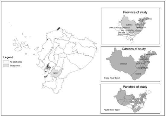 This research was carried out in the rural area of the Paute River Basin, in the province of Azuay, Ecuador. The Paute River Basin is located between the eastern and western Andes mountain ranges of southern Ecuador. The area includes the provinces of Azuay, Cañar, and Morona Santiago. This inter-Andean region covers an area of approximately 6439 km2 that ranges between 440 and 4680 m above sea level [41]. The cantons in the province of Azuay selected for this study were Cuenca, Gualaceo, Paute, Sigsig, Chordeleg, EI Pan, Sevilla de Oro, and Guachapala (Figure 1). These cantons were selected because of their social, economic, demographic, and ecological importance and the different climatic conditions (drought, floods, and landslides, among other natural disasters) they have faced in recent years, which have an effect on food insecurity [42,43,44,45], particularly in rural areas [46].