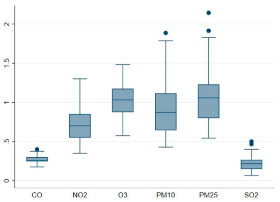 Table 1 reports the summary statistics data used in the regressions and the corresponding data sources. The average of self-reported physical and mental health is 3.12/5 and 22.91/30, respectively. For both health indicators, a higher score suggests a better health status. The income of older adults is 66% of the average income in respective areas (rural or urban) at the province level. The variable income is calculated as the summation of the income from wage, self-employment, capital, pension, and government transfer. Among the income sources, capital income is negative for some respondents. As a result, 24 respondents have relative income as negative in the sample. The average age of respondents in the sample is 62. We also included the city-level average density of each pollutant in the month when respondents were interviewed in Table 1. Since the densities across pollutants are not directly comparable, we compute pollutant-specific indexes by taking the ratio between actual pollutant density and its corresponding national level-2 density limit. These unit-free measurements allow us to compare the pollution levels across different pollutants, and the impact of each pollutant on mental health. As shown in Table 1 and Figure 1, PM2.5, PM10 and O3 appear to be the more severe pollutants: the indexes are above or close to one, suggesting on average, the air pollution levels exceed or close to the national standards. PM2.5 and PM10 indexes show substantial variations with a positive skewness: Many counties have particularly high densities of PM2.5 and PM10. On the other hand, SO2 and CO pollution levels are well below the standards with limited variations, thus are less of concern across counties. The SPI is calculated as the summation of the six unit-free pollutant indexes, indicating the overall air pollution level in a city.
