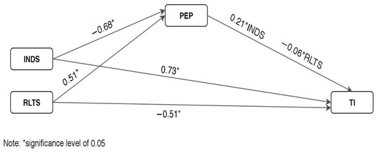 There are many ways of testing for mediation. Some of the most commonly employed test methods are multiple regression analyses and an analysis of moment structures (AMOS) [51,52]. In this study, path analyses are applied to check the possible mediating effects of OID and PEP on TOI, and each mediator is assessed by AMOS module Structural Equation Modeling (SEM) in SPSS.