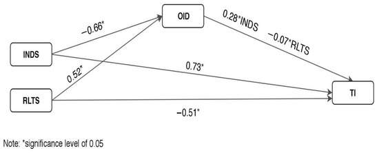 Table 4 shows the summary hypothesis testing results. As the table shows, the mediation influence of OID is stronger than that of PEP. Regarding the direct relation of the self-construal to TOI, the results show that the relationship between the individual self and TOI is statistically negative. In addition, the relationship of the independent self-construal to TOI is negative, verifying the study hypothesis.