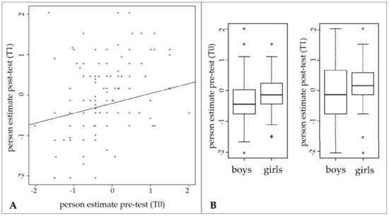 The person estimate indicates person performance and item difficulty based on pre- (T0) and post-tests (T1). To visualise differences, we used a simple regression analysis to observe variances of person estimate scores (logits) (F = 12.66, df = 130, r2 = 0.09, p = 0.001) (Figure 3A).