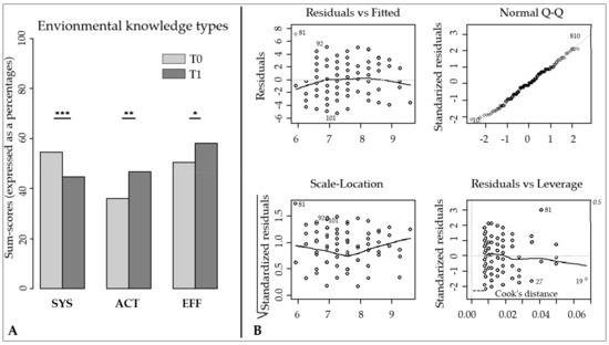 To verify our assumptions, we applied multivariate tests of ANCOVA. For analyses of all three covariates (system (SYS), action-related (ACT) and effectiveness knowledge (EFF)), we used sum-scores (Figure 4A). Results are not based on a specific lesson; they refer to the 10 weeks after the intervention. While system knowledge decreased after having participated in the intervention, action-related and effectiveness knowledge increase. The test quality was acceptable (Figure 4B).