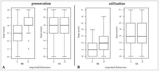 Analysing item preferences of preservation regarding (reported) behaviour, participants with lower logit scores (group one) increased their environmental values after the intervention and were almost at the same level as participants with higher scores (group two) (Figure 5A). We observed similar effects for anthropocentric preferences (utilisation): Here, scores assessing tendencies to exploit nature decreased (Figure 5B). More items of ‘disagree’ and ‘strongly disagree’ were ticked in T1 than in T0 (see methods). No differences between pre-test and post-test were identified for appreciation preferences.