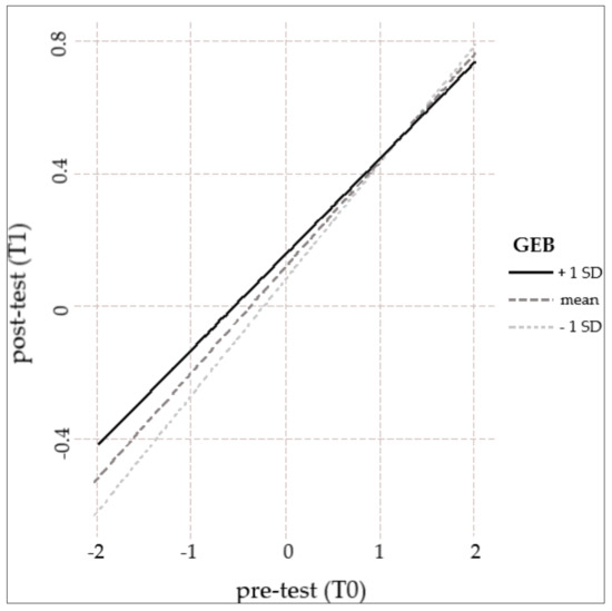 GEB as moderator shows an increased learning curve for environmental knowledge as its main interaction effect. Adolescents with lower logit scores have learned more compared to those with higher logit scores (Figure 6).