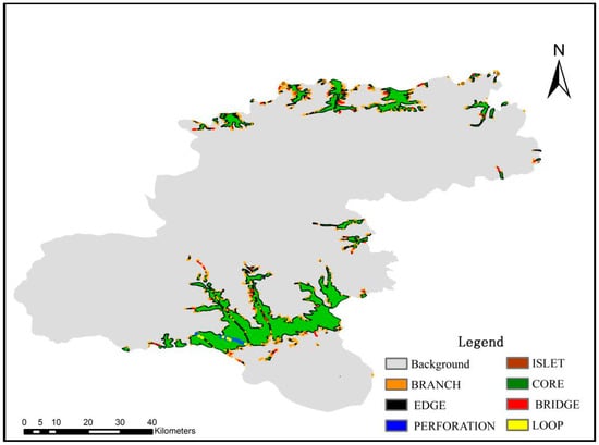 After the classification of land use, woodland, grassland, and waters are extracted to be the foreground, and artificial land and other land as the background, a series of image processing methods are used to divide the foreground into seven non-overlapping categories (namely, core, bridge, edge, branch, loop, islet and performation) (Table 1), and then categories that are important for maintaining connectivity are identified, which increases the scientific nature of the ecological source and ecological corridor selection [36,37].
