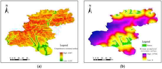 (a) Comprehensive resistance surface and (b) minimal cumulative resistance surface. Drawn by the first author.