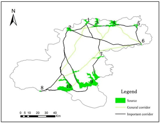Then, using the ArcGIS software platform and the cost distance module in distance, the minimum cumulative cost distance between each pixel and the nearest unit on the cost surface was calculated using the ecological source and comprehensive resistance surface. Then, the cost path module in distance was used to calculate the minimum cost path from the source to the target patch; thus, 45 potential corridors in the study area were generated. The interaction matrix between patches of 10 ecological source areas was calculated using the gravity model. The interaction intensity between patches of different source areas was evaluated in a quantitative way so that the relative importance of potential corridors in the region could be judged more scientifically.