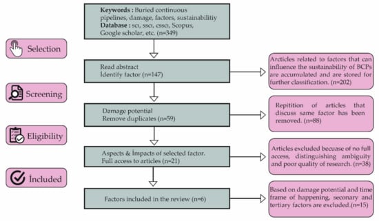 Factors based on high potential damage to BCPs are classified as primary factors. In the current study, six factors such as corrosion, temperature variations, external surface loads, flood, blasting, and earthquake have been considered in this category. Likewise, the factors that may influence the sustainability of BCPs are grouped as secondary factors. There can be excavation damage, incorrect installation, pipe manufacturing errors, high pressure, and exposure to direct sun rays. Further, factors that happen rarely and may have a minor influence on the sustainability of BCPs are termed as tertiary factors. These factors can be falling hail, acid rain, tree roots, or birds perching on pipes and scratching their coating of surface paint with their talons. The process of screening is shown in