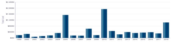 Figure 3 shows the total cost spent on the stability of pipelines in the USA between 1999 and 2018, as reported by Pipeline and Hazardous Materials Safety Administration (PHMSA) [