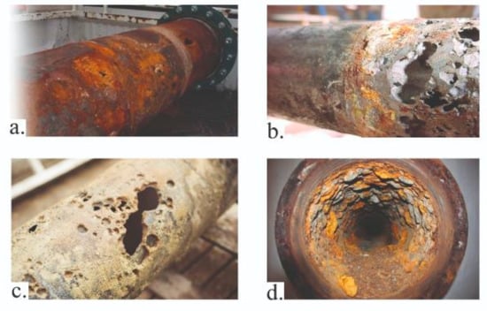 Figure 5a shows the external surface corrosion that usually happens due to the damage of external surface and can be handled by using cathodic protection technique or by the application of new coatings/painting on the external surface.