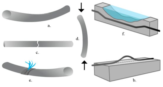 Figure 5c shows the pitting corrosion that usually happens on passive metals or their composite alloys. This is usually caused by damage to the external thin layer, also known as the oxide film, and generates pits on the damaged surface. Erosion corrosion happens in buried water pipes and is shown in