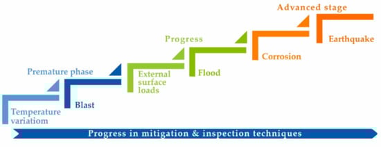 It has been noticed that many articles related to the discussed topic are available; however, the topic is still confused, unclear, and has conflicts. Despite these studies, there is still space for a comprehensive review report to be performed in this domain. The current research manages, classifies, and fills the gap in this sphere. Six primary factors (corrosion, earthquake, flood, external loads, temperature variation, and blasting) are identified and are discussed in detail.