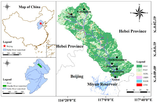 The Miyun Reservoir is a surface water source and ecological conservation area in Beijing, and is known as “the water of life in Beijing” [51]. The Chaohe River basin is one of the main tributaries of the Miyun Reservoir. It is located northeast of Beijing and has a geographical location of 116°7′–117°35′ E, 40°19′–41°38′ N. It originates from the Fengning Manchu Autonomous County of Hebei Province, flowing through Luanping County and Beijing Miyun District, and finally flowing into Miyun Reservoir with a catchment area of 4888 km2 (Figure 1).