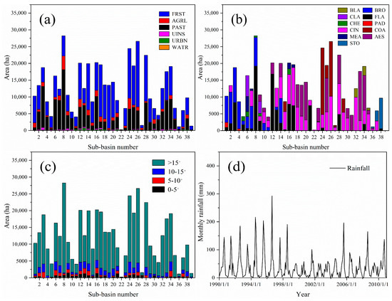 Proportion of different (a) land use types, (b) soil types (c) slope types in the sub-basins and (d) monthly rainfall in the basin during the study period.