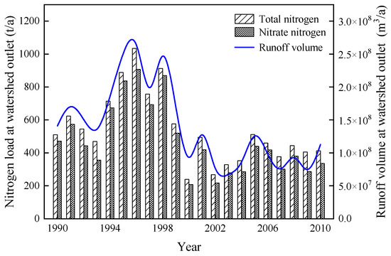 In Figure 5, the abscissa represents the study period; the left y-axis represents the total nitrogen and nitrate nitrogen loads each year, the unit is tons/year (t/a); and the right y-axis represents the annual runoff, the unit is cubic meters/year (m3/a). It can be seen from Figure 5 that the annual runoff from 1990 to 2010 in the Chaohe River basin is between 5.67 × 107−2.94 × 108 m3, and multi-year average annual runoff is 1.40 × 108 m3. During the 21 years of the study period, the annual load of total nitrogen is between 239.71–1033.58 t and the annual load of nitrate nitrogen is between 208.03–901.16 t, and the multi-year average annual loads of total nitrogen and nitrate nitrogen are 539.07 t and 471.90 t, respectively. The nitrate nitrogen load accounts for most of the total nitrogen load, with an average annual proportion of 87.54%. The three outputs—runoff, and total nitrogen and nitrate nitrogen loads—are significantly lower after 1999 than before 1999. The main reason is that the implementation of the policy of returning farmland to forest and grassland began in 1999 and the “Beijing-Tianjin Sandstorm Source Control Project Soil and Water Conservation Project” began in 2000 [63,64]. The forest coverage in the Chaohe River basin increased from 54.14% in 2000 to 76.96% in 2012. The rapid increase of forest land has a great impact on the water cycle process of the basin, which attenuates the direct response of surface runoff to precipitation while increasing evaporation [48,65,66,67], thus, greatly reducing the runoff from the basin [68].