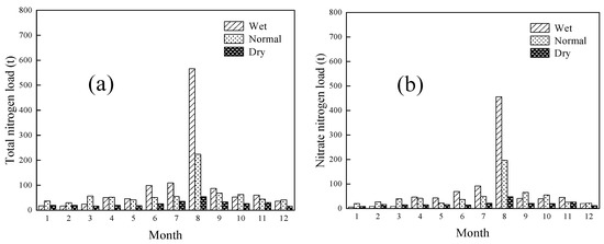 Different indicators of wet and dry periods correspond to different methods of wet and dry evaluation, and there are many different methods for selecting wet and dry indicators, such as frequency analysis, fuzzy clustering, Gamma distribution, and mean standard deviation. This paper uses the frequency analysis method to divide the different hydrological years. According to the multi-year monitoring data of various rainfall stations in Miyun Reservoir basin, the annual average rainfall of each station was arranged in descending order, and using Weibull’s experience frequency equation, the mathematical expectation of rainfall in different years from each station can be obtained. Referring to Zhang [69] for the division of different hydrological years in the Miyun Reservoir basin, the criteria for the classification of wet and dry (wet year = 25%; normal year = 50%; dry year = 75%), it was determined that the years 1996, 1997, and 2002 were the wet year, normal year, and dry year, respectively. It can be seen from Figure 6 that in the different hydrological years, the total nitrogen and nitrate nitrogen loads in the basin are mainly concentrated in the flood season, that is, from June to October [49,54]. The total nitrogen load in the flood season accounts for 78.51%, 60.38%, and 55.57% of the full year load of the wet year, normal year, and dry year, respectively. The nitrate nitrogen load in the flood season accounts for 79.52%, 67.08% and 53.24% of the full year load of the wet year, normal year, and dry year, respectively. The annual total nitrogen load in the wet year is 1.53 and 3.70 times that of the normal year and dry year, respectively. The annual nitrate nitrogen load in the wet year is 1.46 and 3.75 times that of the normal year and dry year, respectively [70]. It can be seen that the total nitrogen and nitrate nitrogen load in the basin is very different in the different hydrological years and hydrological periods. It can be considered that the wet year is the key year for nitrogen load in the basin, and the nitrogen load is mainly concentrated in the flood season.