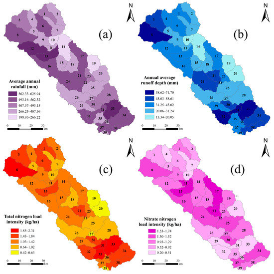 (a) Rainfall, (b) runoff depth, (c) total nitrogen load and (d) nitrate nitrogen load distributions of Chaohe River watershed.