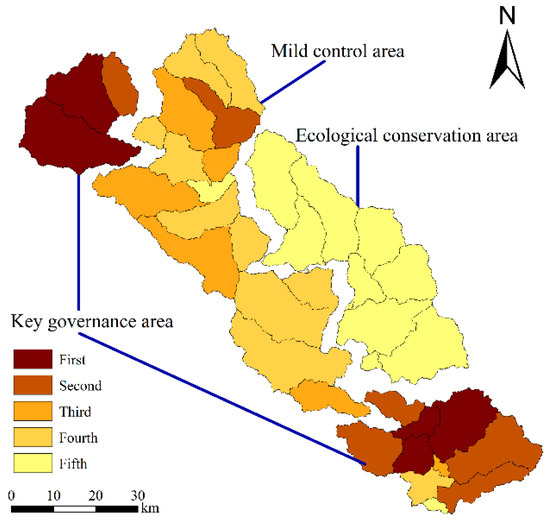 In the flood season and non-flood season, the total nitrogen load in the wet year is higher than that in the normal year and the dry year. Therefore, when the watershed nitrogen load is subdivided, the partitioning results of the annual nitrogen load of the wet year should be given priority. For example, in the flood season of the normal year, a sub-basin may be classified as a potential source area, but in the flood season of the wet year, it is classified as a primary source area, then the sub-basin ultimately belongs to the first-level CSAs. At the same time, the nitrogen load in the basin is mainly concentrated in the flood season. The nitrogen load in the flood season is several times that of the non-flood season. Therefore, in the final zonation of nitrogen load, the partitioning results of the flood season should also be observed. For example, in the non-flood season of the wet year, a sub-basin may be classified as a potential source area; however, in the flood season of the wet year, it is classified as a primary source area, therefore the sub-basin ultimately belongs to the first-level CSAs. Combined with the administrative division characteristics of the Chaohe River basin, the watershed is divided into three types of regions (four parts), which are the key governance area, mild control area, and ecological conservation area. The final zonation results of nitrogen load in the Chaohe River basin are shown in Figure 9.