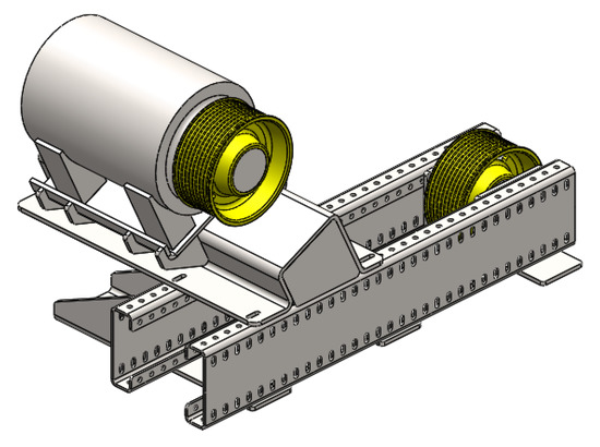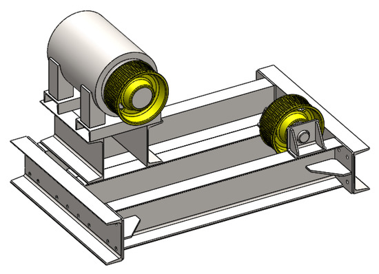 Until now, the carrying frames have been made from hot-rolled profiles of type C and 2T, joined by means of welding technology. High stiffness is a significant advantage of such structures due to the way they are manufactured [9]. However, the manufacturing process is too long and the total frame weight exceeds the installation capabilities of a team. Additional equipment, such as hoists, are often necessary. The fact that this solution lacks versatility is another significant disadvantage. If the position of the power unit in relation to the frame must be modified, it is necessary to perform time consuming work, such as cutting the welded profiles, mechanical cleaning, and re-welding. To fulfil the weight and technology-related criteria and to pursue the manufacturing processes developments the carrying frames in the form of cold-rolled profiles have been introduced. The profiles are pre-prepared by using laser cutting technology. This technology used in the preparation of frame semi-products significantly decreases the time of installation, which is reduced to the welding processes, kept to minimum by replacing them with separable assembling by means of bolts. The structure versatility in terms of changes resulting from the lifting mechanism configuration, e.g., carrying ropes spacing, is an advantage of this solution, as is fast installation and its significantly lower unladen weight. Moreover, it is possible to transport the structure in pieces to the place of installation. Thus, it is not necessary to use any additional transportation equipment. A disadvantage of such an approach to the structure is the need to make additional calculations of the structural effort due to the presence of loads, which requires knowledge of the highly precise scheme of loads. The application of finite element method (FEM) analysis is described in publications in many scientific areas. In [10], the authors described the application of the FEM method to the analysis of the aircraft suspension. The results obtained from experimental studies were comparable to the results obtained from the numerical analysis. In [11] the authors focused on optimising the frame with regard to its weight. They offered optimized profiles in terms of dimensions while maintaining the appropriate value of slips. In addition, the FEM method is used to determine torsional flexural buckling in steel columns, expanded in [12], and to analyse the braking system of the friction crane described in [13]. The authors in [14,15] present the operation of safety gears as a result of changing operating conditions and based on experimental studies carried out wavelet analysis of the results obtained. Apart from the above-mentioned articles describing the FEM simulation method, literature contains publications about such methods as the discrete element method (DEM) described, inter alia, in [16,17], general particle dynamics (GPD) presented in [16,17,18], or peridynamics discussed in [19,20,21,22,23,24,25,26,27].