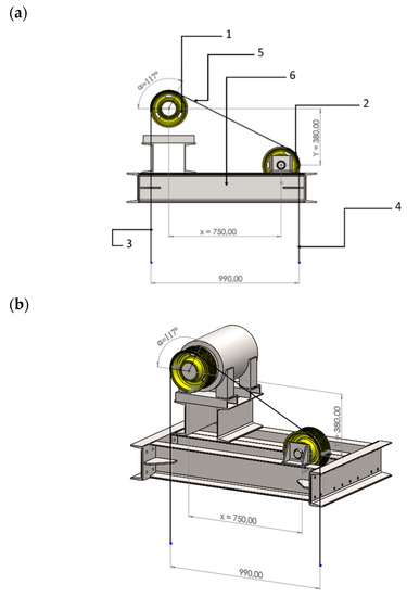 A three-dimensional model of the friction lift carrying structure with the geometry of the carrying ropes system and main dimensions (a) a front view, (b) an isometric view: 1—a power unit with a friction wheel; 2—a motion output wheel; 3—descent of ropes on the cabin side; 4—descent of ropes on the counterweight side; 5—carrying ropes; 6—a power unit carrying frame.