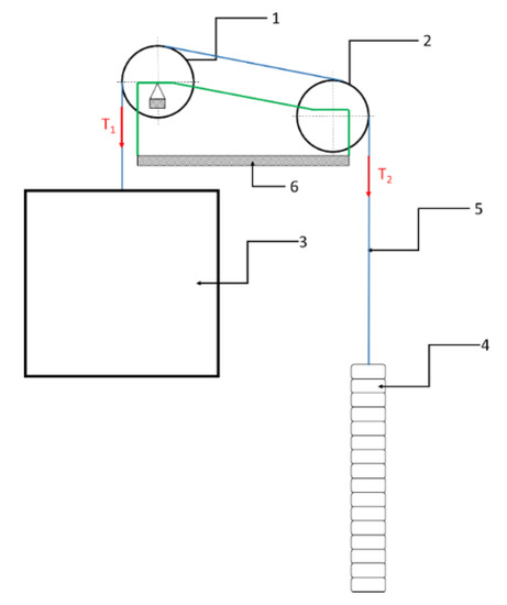 A schematic diagram of the friction lift structure: 1—a friction wheel of the power unit; 2—a motion output wheel; 3—a cabin; 4—a counterweight; 5—carrying ropes; 6—carrying frame of the power unit.