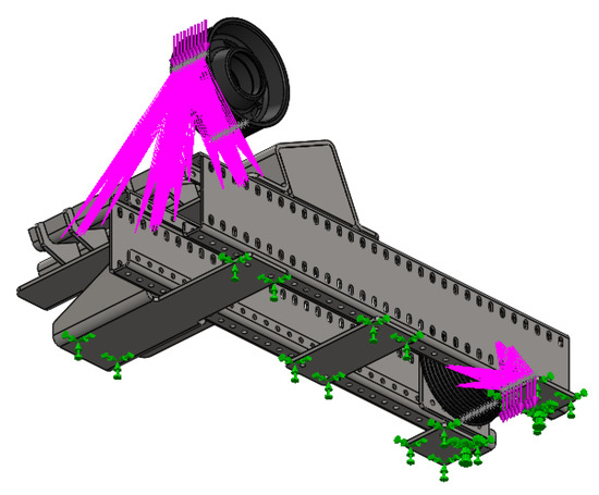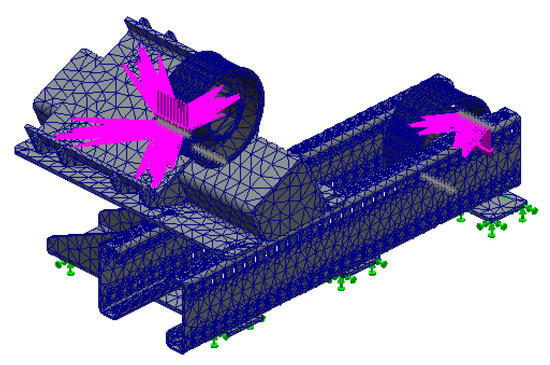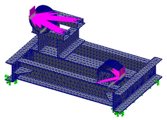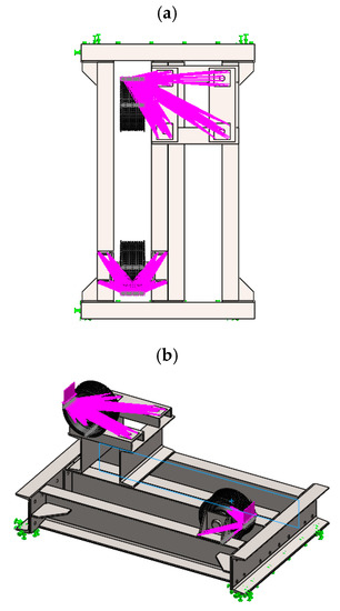 The load values are consistent with Table 2 referring to the restraint of the power unit with the carrying frame. The frame numerical model with boundary conditions defined is presented in Figure 7. In Figure 7, Figure 8, Figure 9, Figure 10, Figure 11, Figure 12 and Figure 13 the color pink shows the directions of forces caused by the remote load that was applied.