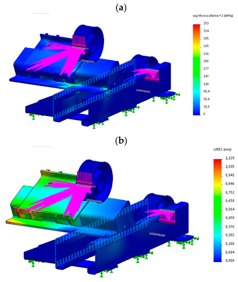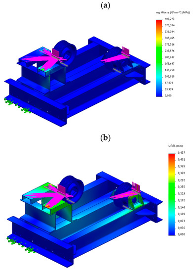 A numerical model of the lift carrying frame in the existing form and for the first case of the load: (a) distribution of stresses, (b) distribution of nodular displacements increase.