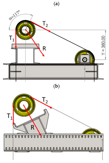 Indices describing the values of T forces in respective cases stand for: the first digit refers to force on the friction wheel side, the second digit refers to the examined case. Basing on the assumed weight conditions described in Table 1 and equations determined on the basis of the PN EN 81.20 standard [40], the values of forces which load the frame system are compiled in Table 2.