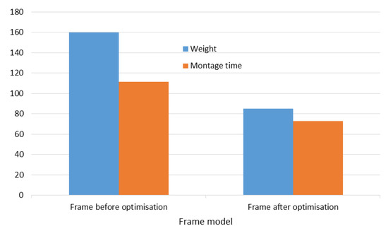 One more advantage of three-dimensional modelling and numerical simulation is the possibility to perform virtual installation, to adjust the solution versatility range and to find the most optimal solution for the manufacturing time reduction. It should be noticed that welding processes are time-consuming and expensive. Thus, in this particular case it would be difficult to fulfil an economic criterion. The structure optimization in relation to economic aspects has significant impact on total investment-related costs. This was evidenced using the example of the times needed to perform respective operations. The results of the frames weight reduction in both cases and the installation time reduction are presented in Figure 15.