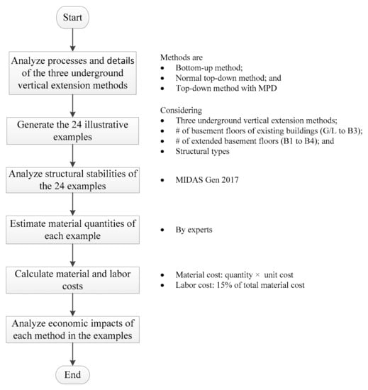 The structure of this paper is as follows. Section 2 describes the materials and research methods used in this paper. Section 3 includes processes and details of three sustainable vertical extension methods for underground spaces in existing buildings. Section 4 describes the overview of the 24 illustrative examples. Section 5 includes results of the structural analyses with the three sustainable vertical extension methods for underground spaces in existing buildings. In Section 6, the economic impacts of the three sustainable vertical extension methods for underground spaces in the illustrative examples are analyzed, followed by discussion and conclusions in Section 7.