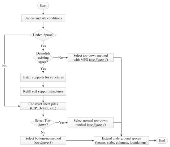 In this paper, the three sustainable vertical extension methods used for underground spaces in existing buildings were the bottom-up, normal top-down, and top-down with MPDs methods. In selecting a vertical extension method for this paper, two conditions were considered: (1) a building has more than one basement floor, and (2) an existing underground structure can be demolished or reused for vertical extensions. The normal top-down and bottom-up methods can be used for vertically expanding underground spaces after demolishing existing underground structures [19]. The top-down method with MPD can expand underground space without demolishing existing underground structures.