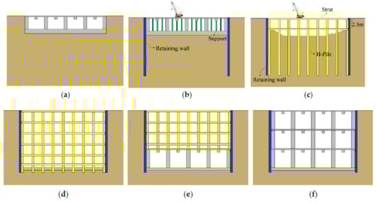The vertical underground extension using the bottom-up method constructs structural frames after completing excavation to foundation levels using temporary struts. Figure 3 represents the construction process of the bottom-up method with struts, from the first basement level to the third basement level. Underground spaces were extended vertically after demolishing the basements of the existing building. Before demolishing, the existing structure needed to be reinforced with temporary members to support the weight of the equipment for installing the new retaining walls (Figure 3b). After Installing retaining walls, temporary struts and H-piles were installed to provide horizontal and vertical structural stability for the underground space during the dismantling of the existing structure and the excavation for an extension. The vertical interval of the struts was 2.5 m. Structural frames for the underground space were constructed from the lowest bottom level to the ground level. After the structural frame of a floor was completed, the temporary members installed on the floor such as struts were removed, as shown in Figure 3e.