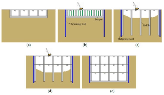 - Jung, S.J.; Kim, S.-K.; Seo, S.Y. Structural safety of the building constructed by top-down method corresponding to earth pressure distribution and floor system. J. Archit. Inst. Korea Plan Des. 2017, 33, 3–10. [Google Scholar]