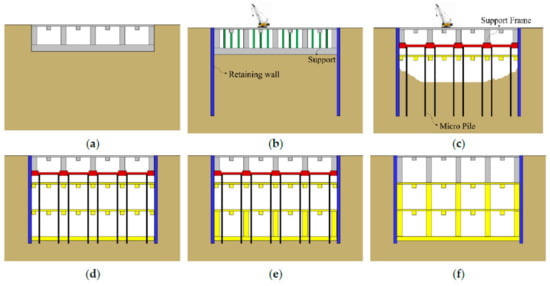 Figure 5 represents the process of vertically expanding existing underground spaces without demolishing existing structures, from the first basement level to the third basement level, using the top-down method with MPDs. To extend underground space vertically after reinforcing existing underground structure without its demolition, several pieces of equipment were placed at the top of the existing underground structure in order to install additional earth retaining walls. Therefore, prior to installation of the earth retaining walls, the supports for the structural stability of the existing slabs were installed and reinforced by considering the loads from the equipment for the earthwork (Figure 5b). To prevent the collapse of columns in the basement of the existing building during the excavation, it was necessary to install multiple posts, such as micro piles, around the columns, as shown in Figure 5c. The four micro piles installed on the outside of one column were slender, resulting in the buckling behavior. Therefore, it was necessary to tie up those to one set and connect several sets of micro piles to reduce the risk of buckling failure. Then, the foundation of the existing building was demolished, and excavation work was carried out from the bottom level of the existing building up to the extended bottom level. After completing the installation of the new foundations and columns located in the extended underground structure, as shown in Figure 5d,e, the temporary micro piles were removed.