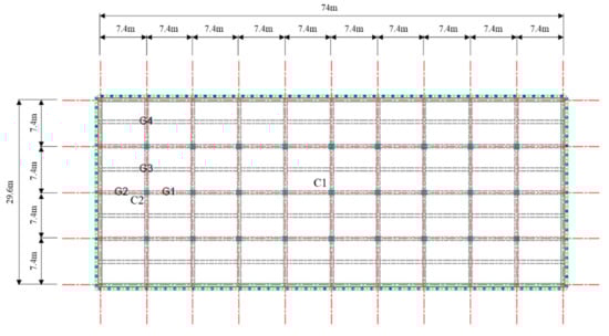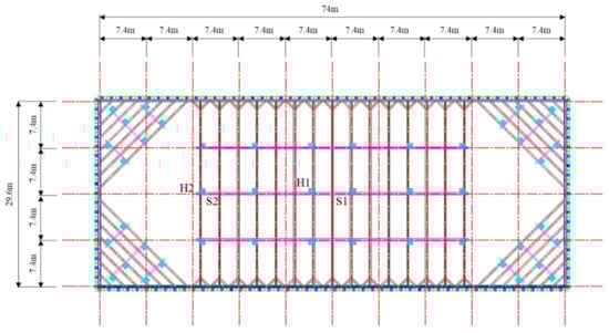 A rectangular-shaped underground structure was used to generate illustrative examples in this paper. The effects of the shape were not considered to simplify comparative analysis of the economic impacts corresponding to sustainable vertical extension methods of existing underground spaces. The structure used for the illustrative examples has a floor plan of 74.0 × 29.6 m (Figure 6 and Figure 7), with a floor height of 3.4 m at each basement.