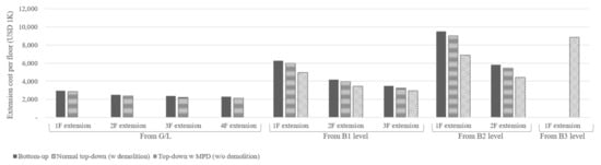 Table 6 represents the sustainable vertical underground extension costs of the 24 illustrative examples. Unlike other methods, the top-down with MPD method includes reinforcement costs and does not include demolition costs. Also, the sustainable vertical underground extension cost of an existing building without a basement floor does not include demolition costs. Figure 10 shows the sustainable vertical underground extension cost per extended floor considering the number of basement floors of an existing building (G/L to B3) and the number of extended basement floors (one to four floor extension). In the illustrative examples, to vertically extend the underground space of an existing building without a basement floor, the extension costs using the bottom-up and the normal top-down methods were compared. It is difficult for the bottom-up and the normal top-down methods with PRD and RCD to vertically extend the underground space of an existing building with more than three basement floors. Therefore, they were not included when analyzing and comparing the economic impacts of vertical underground extension methods. In all examples using the three methods, the larger the number of basement floors of existing buildings, the greater the cost per extended basement floor. The larger the number of basement floors of existing buildings, the higher the cost of demolition and reinforcement works. In particular, the cost of demolition work was strongly related to the number of basement floors of existing buildings. Also, the larger the number of vertically extended basement floors, the dramatically less the extension cost per extended floor in all examples.