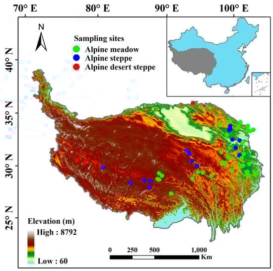 - Lu, X.; Yan, Y.; Sun, J.; Zhang, X.; Chen, Y.; Wang, X.; Cheng, G. Carbon, nitrogen, and phosphorus storage in alpine grassland ecosystems of Tibet: Effects of grazing exclusion. Ecol. Evol. 2015, 5, 4492–4504. [Google Scholar] [CrossRef]