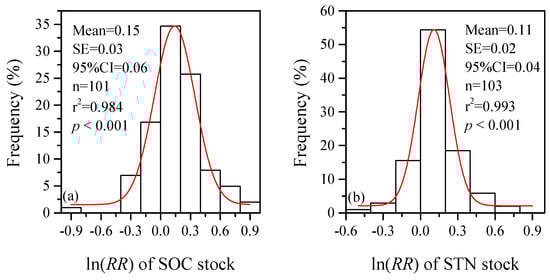 Frequency distributions of the effect sizes of soil organic carbon (SOC) (a) and soil total nitrogen (STN) (b) stocks among all observations. The curves were fitted by a Gaussian function. ln(RR) indicates response ratio.