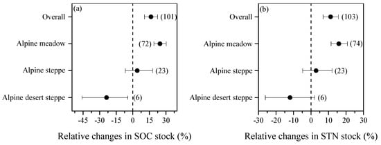 Relative changes in soil organic carbon (SOC) (a) and soil total nitrogen (STN) (b) stocks after grazing exclusion. Points are means with 95% confidence intervals. Numbers of experimental observations are in parentheses.