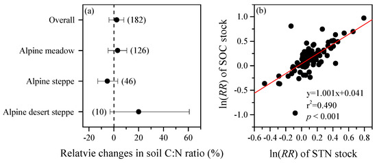 Effects of grazing exclusion on soil carbon-nitrogen (C-N) coupling relationship: (a) relative changes in soil C:N ratio after grazing exclusion; (b) relationship between the effect size of soil organic carbon (SOC) stock and that of soil total nitrogen (STN) stock. ln(RR) indicates response ratio.
