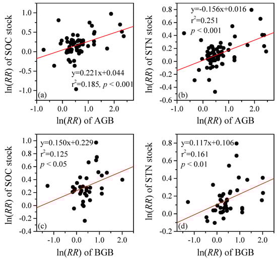 As shown in Figure 5a,b, the effect sizes of both SOC (r2 = 0.185, p < 0.001) and STN stocks (r2 = 0.251, p < 0.001) were positively correlated to that of AGB. Positive relationship was also observed between the effect size of SOC stock and that of BGB (r2 = 0.125, p < 0.05) (Figure 5c). Similarly, the effect size of STN stock showed a positive relationship with that of BGB (r2 = 0.161, p < 0.01) (Figure 5d). However, the relationships between the effect sizes of SOC stock, STN stock, AGB, and BGB were generally weak because the r2 values were low.