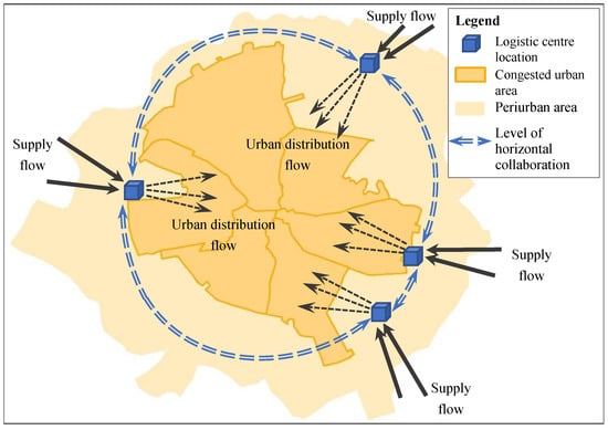 In order to obtain a sustainable logistic solution, a collaborative logistic scheme with four collaborative centers is analyzed (Figure 1). Each provider or group of providers that uses the same urban road access is assigned to supply a single center, least affected by general traffic congestion conditions. All centers are located in such a way so as to allow easy transfer between them. The distances between two adjacent centers are from 10 to 25 km, with the average distance between centers L = 18 km. Each center has to distribute all freight categories required in the urban distribution, so collaboration between the centers is necessary.