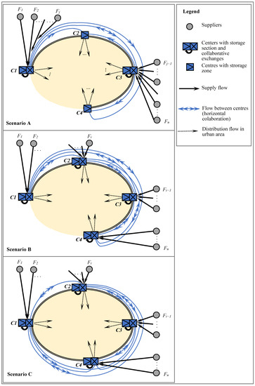 In other words, each solution proposed for the resources horizontal mutualization involved in the large distribution logistics bears the imprint of the links between transport and the spatial planning. Further research will be required for developing software tools and simulation models [28,32] so as to identify appropriate solutions for each peculiar case (with different variants of collaboration and mutualization, heterogeneous vehicles, etc.).