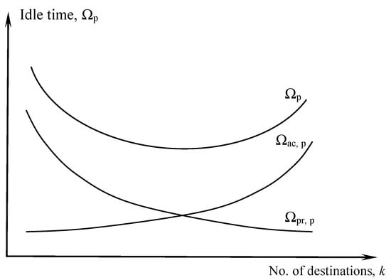 In each center, both categories of the idle time mentioned above, Ωac, p and Ωpr, p, depend on the number of destinations k (Figure 3) defined in the consolidation scheme.