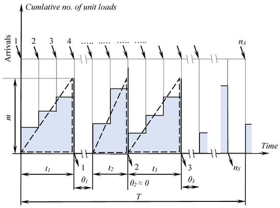 For any of the p logistic platforms of the UDCs from which a shipment that consists in loading units (pallets) for a certain destination (logistic platform of another UDC) is to be made, the idle time in a period T (Figure 4) is the sum of the hatched areas (approximated by the areas of the triangles represented by dashed lines), that is: