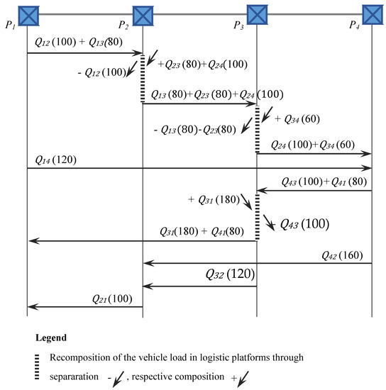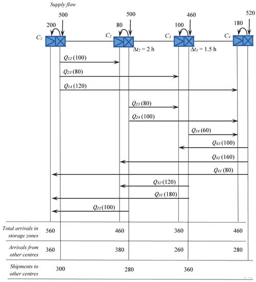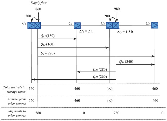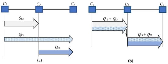 For example, if for the case of three centers C1, C2 and C3, instead of each flow being subject to separate shipments (Figure 5a), the Q12 and Q13 flow (Figure 5b) are combined in C1, in a heterogeneous shipment, then in C2, where Q12 flow has to be separated, for each flow entity Q13 an additional idle time, , appears.