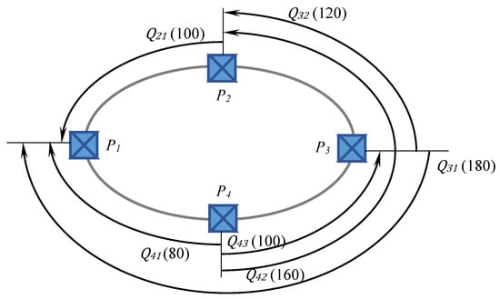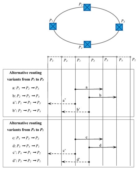 As mentioned, the road infrastructure development in the area where the UDCs are located will probably facilitate the exchange relations between the centers’ logistic platforms. By placing the logistic platforms on the road ring, a new problem appears in the analysis. Namely, alternative routes can be used between the non-neighboring logistics platforms, as illustrated in Figure 9.